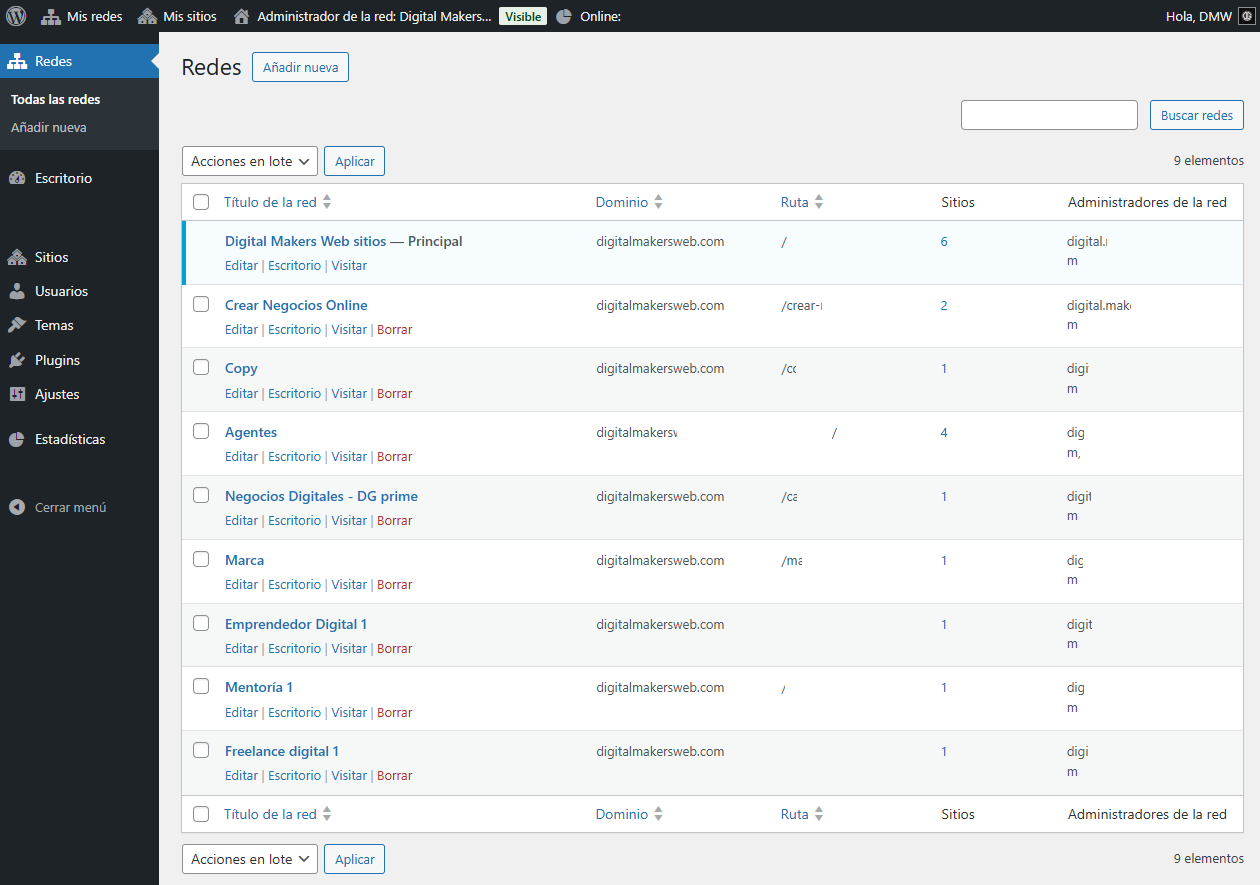 • Puedes crear redes de sitios web que son independientes. Cada red puede ser administrada de forma independiente con sus multisitios. Puedes registrar más dominios y pedirnos que te los apuntemos a cada red o multisitio o subsitio.